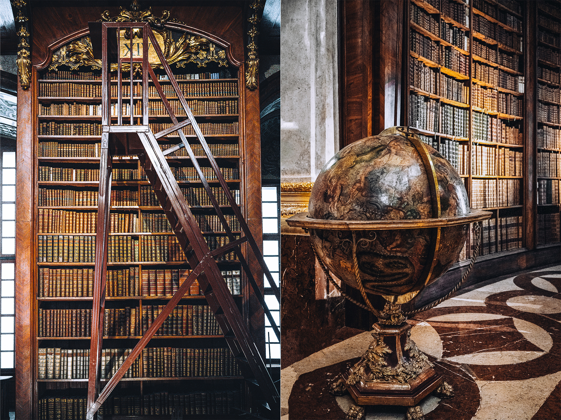 The books in this library aren’t the sole protagonists; approximately 16 statues and 12 busts of the Austro-Spanish Habsburg family, carved in marble stand around the room. Emperor Charles VI’s “Hercules Musarum” statue is prominently positioned beneath the dome, surrounded by four magnificent celestial and terrestrial Venetian globes. It is a journey back to the glory of the Habsburg, who were passionate collectors of books and manuscripts.